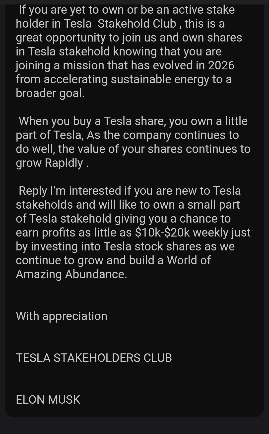 My favorite part is this completely disjointed paragraph: “If you are yet to own or be an active stake holder in Tesla Stakehold Club, this is a great opportunity to join us… knowing that you are joining a mission that has evolved in 2026 from accelerating sustainable energy to a broader goal.” What? It starts off talking about a ‘stakehold club’ (whatever that means) and ends up vaguely rambling about a broader goal.